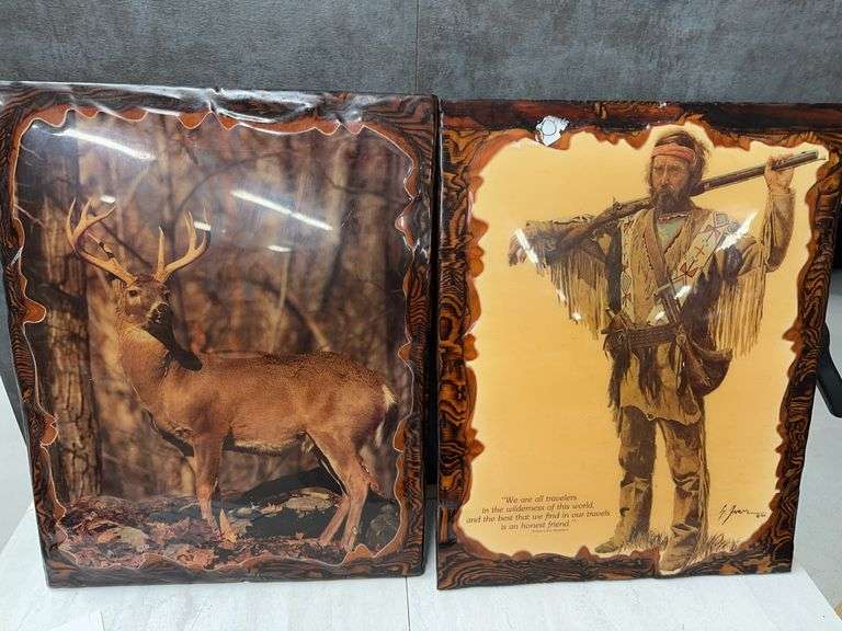 DescriptionTwo framed prints featuring a buck deer in a forest scene and a mountain man with a rifle. The mountain man print includes a quote by Robert Louis Stevenson. The frames have a wood grain appearance.