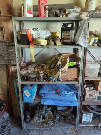 DescriptionIncludes shelves filled with containers of All Seasons Horticultural Spray Oil, Bug Gon, Spectracide Acre Plus Triazicide Insect Killer, Kiwi Leather Dye, SOS cleaner, Homax Ceiling Texture, Mobil GTX motor oil, ratchet straps, a ceiling texture box, automotive parts, a faucet, and other hardware.