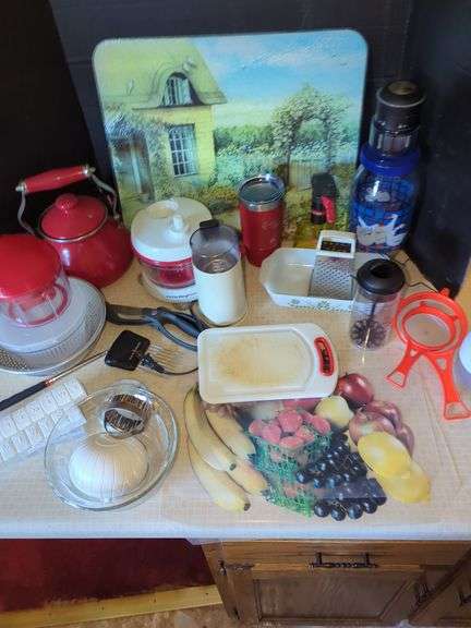Includes cutting boards, red enamel kettle, food choppers, stainless steel mixing bowl, graters, oil dispenser, cocoa cola tumbler, sieves, kitchen shears, pill organizers, meat tenderizer, and a glass beverage dispenser.