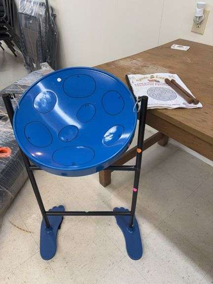 Panyard Jumbie Jam steel pan drum in blue, along with two mallets and a songbook featuring easy-to-read sheet music for popular songs.