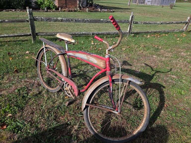 DescriptionRed bicycle. Features curved handlebars with red grips, front and rear fenders, rear rack, and white seat.